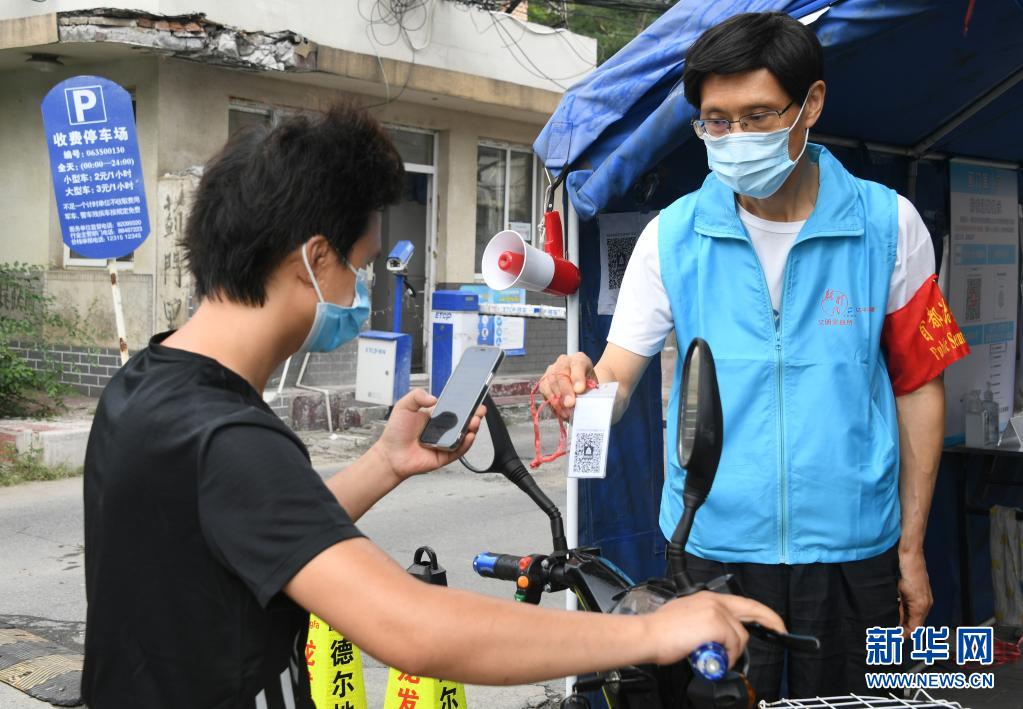 8月14日,在北京市海淀區(qū)薊門里社區(qū)出入口,馮向東(右)指導(dǎo)進入社區(qū)的人員掃描健康寶。