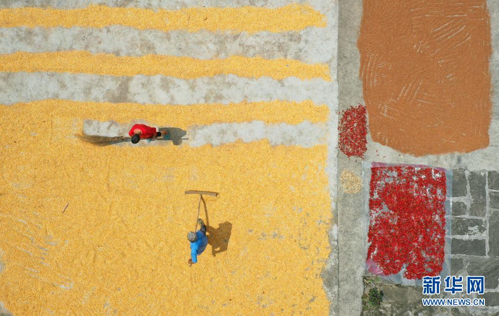 8月17日,赤水市華陽村的村民在晾曬玉米(無人機照片)。