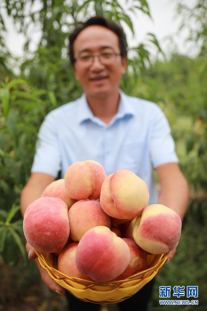8月18日,方志利展示剛采摘的桃子。新華社記者 杜哲宇 攝
