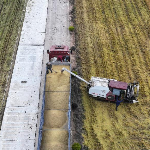10月29日,在大通湖区河坝镇王家湖村,农机手驾驶收割机将稻谷装车(无人机照片)。