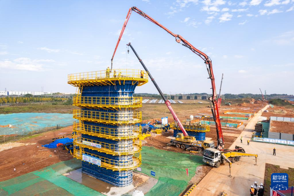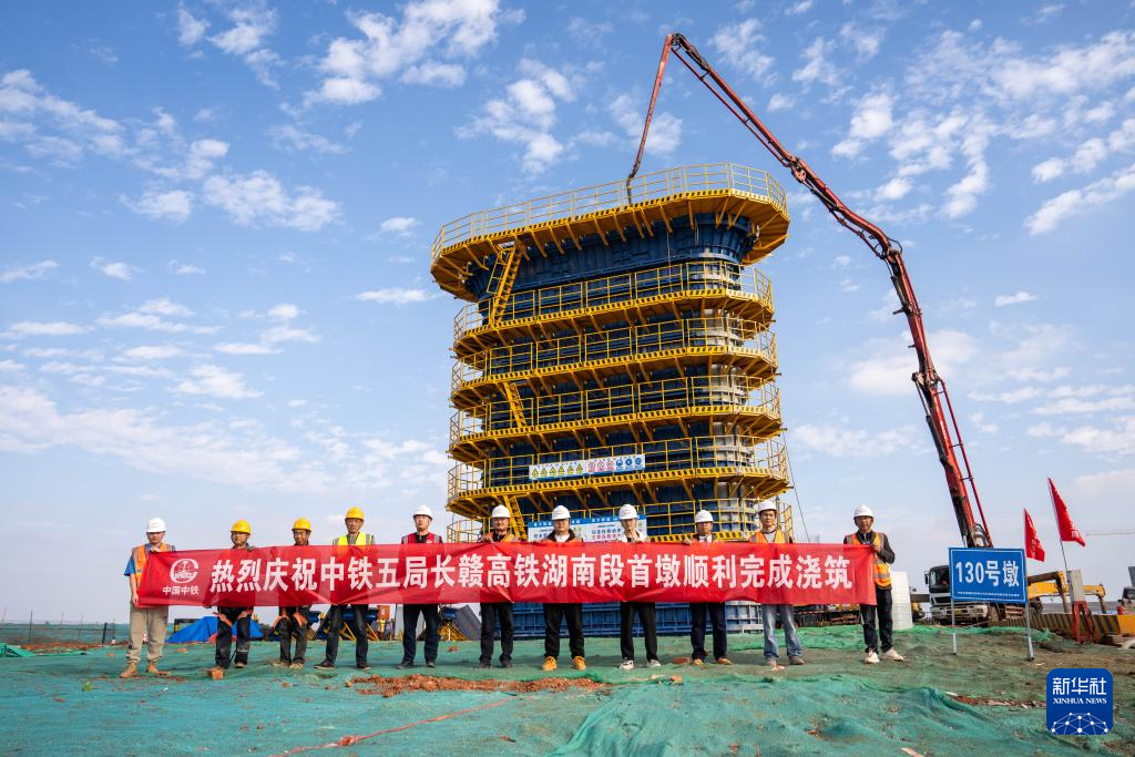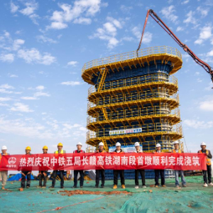 当日,由中铁五局承建的长赣高铁关键控制性工程机场高速特大桥130号墩完成混凝土浇筑,这是长赣高铁湖南段首座完成浇筑的桥梁墩柱。