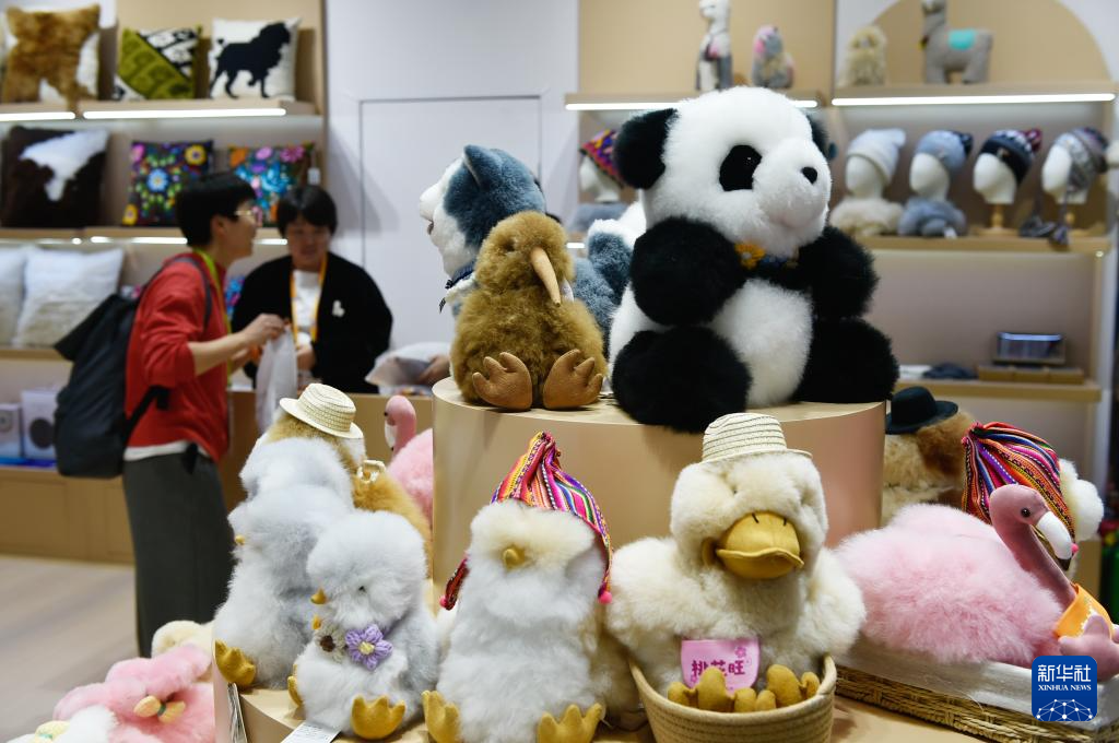11月5日,观众在第八届进博会消费品展区选购毛绒玩具。