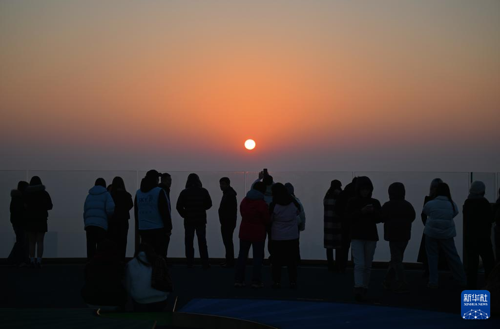 游人在津湾云顶高空观景台欣赏落日(12月20日摄)。