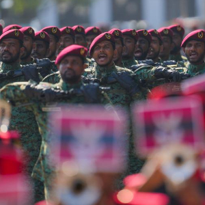 2月4日,在斯里兰卡首都科伦坡,斯里兰卡总统迪萨纳亚克(中)出席独立日庆祝活动。