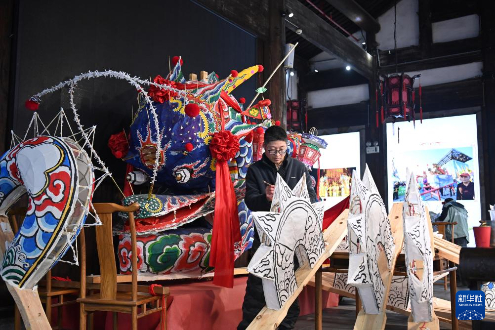 2月5日,在浙江省东阳市卢宅景区,工作人员制作春节期间传统迎龙灯体验活动用的龙灯。