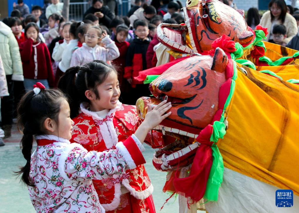 2月5日,在河南省焦作市博爱县清化镇街道七街小学,学生们与进行老虎舞表演的“老虎”互动。