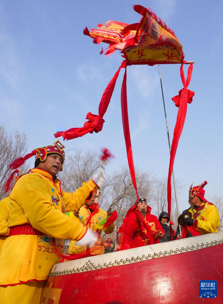 2月5日,在山东省邹平市台子镇,黄河大鼓表演队在文艺广场为村民表演。
