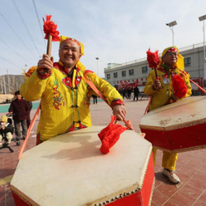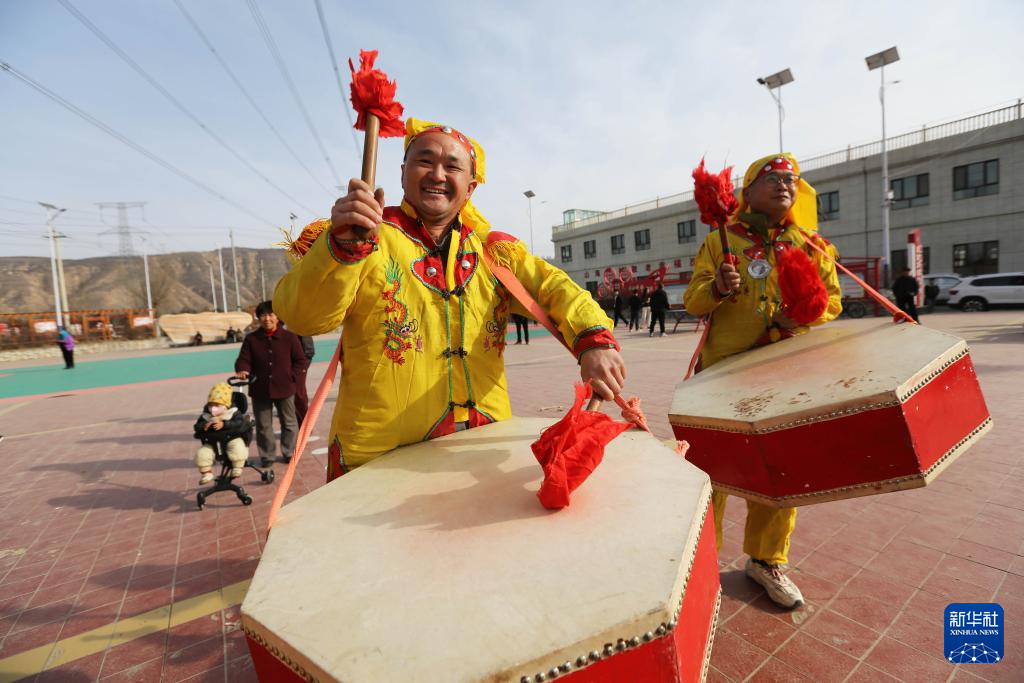 2月5日,甘肃省定西市安定区巉口镇的社火队队员在为春节表演进行排练。