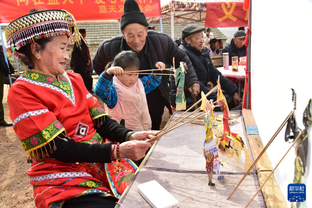 2月5日,山东省枣庄市山亭区水泉镇柴山前村举行“春晚”年会,一名小姑娘跟随民间艺人学习皮影戏。