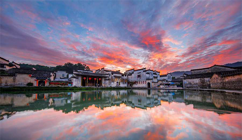 夏日时节,位于安徽省黄山市黟县西递和宏村古村的传统徽派建筑沐浴在朝霞之中,美如画卷。
