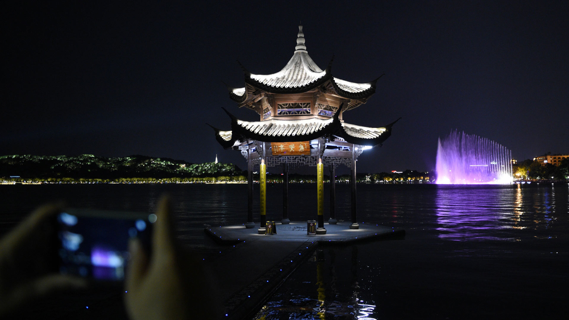 8月29日,游客在西湖集賢亭邊欣賞西湖夜色
