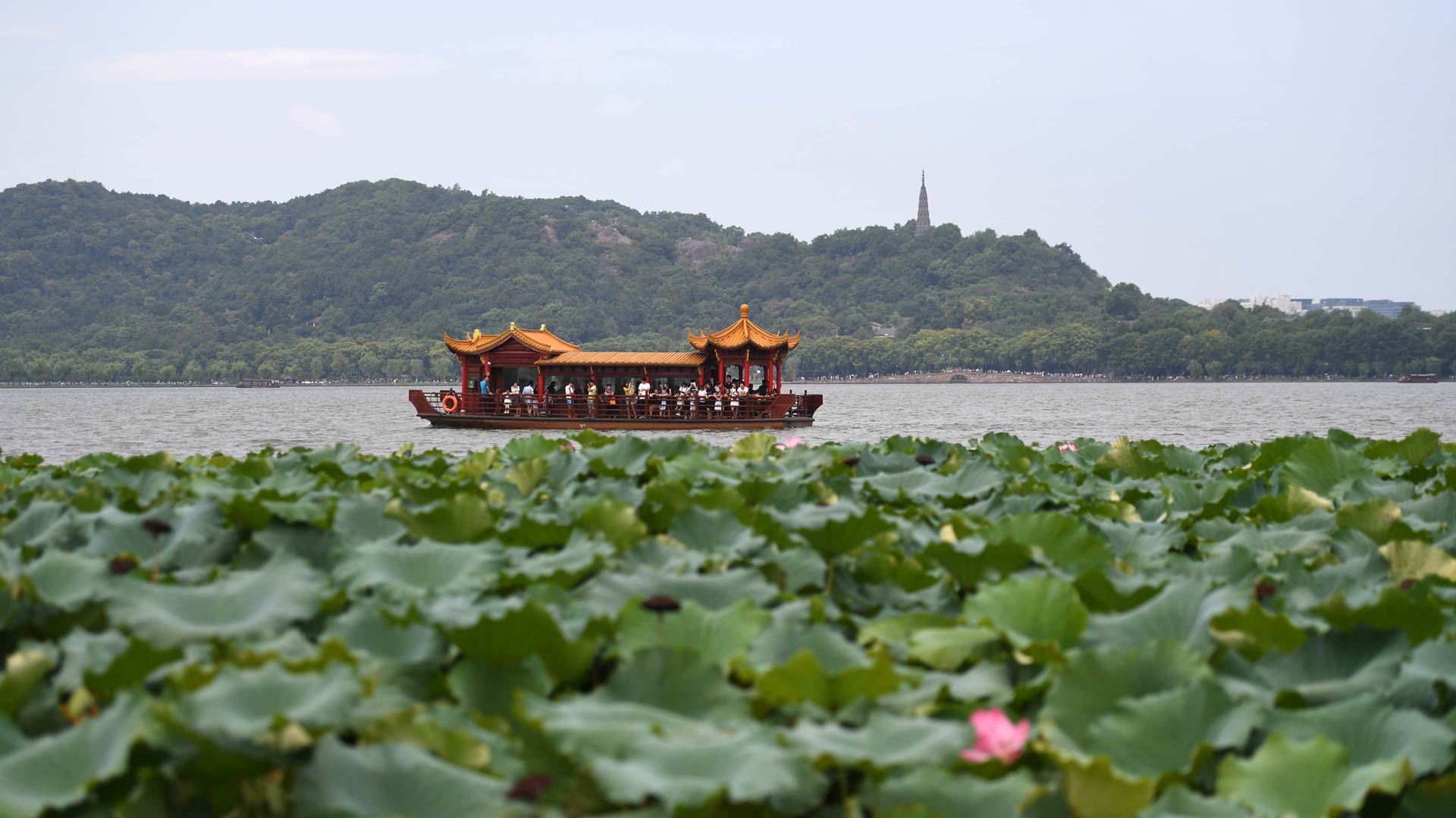 游客乘坐游船在西湖上游覽(8月27日攝)。 “三面云山一面城”,西湖的美麗自古就為眾多的作家和藝術家所稱頌?!拔骱啊北徽J為是“天人合一”最理想最經典的景觀體現。(新華社記者 陳曄華 攝)