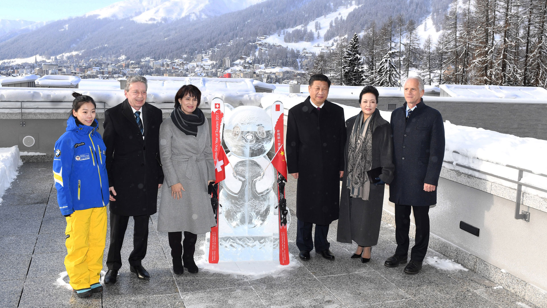1月17日,國家主席習近平同瑞士聯邦主席洛伊特哈德在達沃斯共同啟動中瑞旅游年。兩國元首在熊貓冰雕像和印有中瑞兩國國旗及“中瑞旅游年”字樣的滑雪板旁合影留念。新華社記者 饒愛民 攝2017-01-18