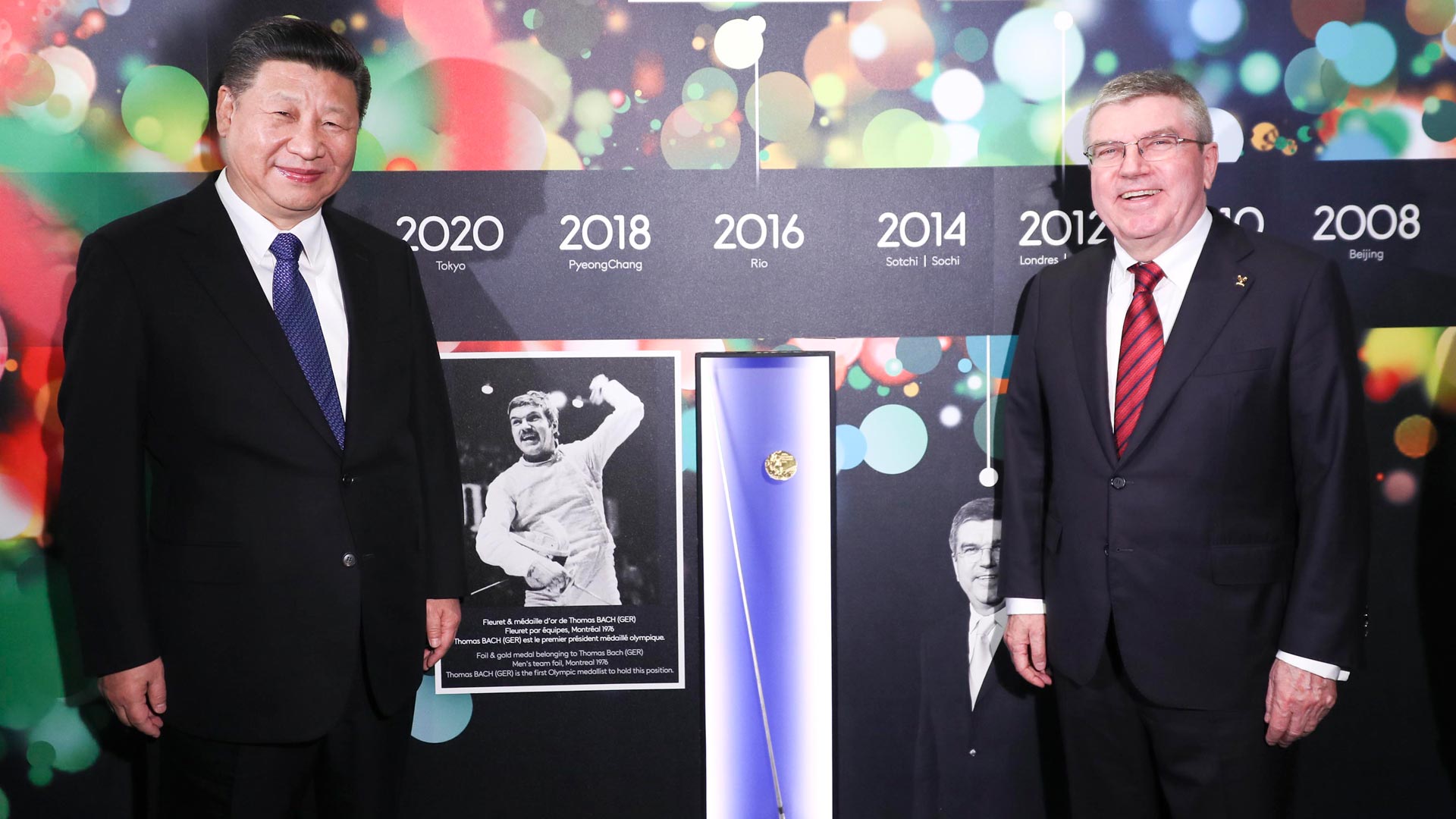 1月18日,國家主席習近平在瑞士洛桑國際奧林匹克博物館會見國際奧林匹克委員會主席巴赫。這是習近平和巴赫在奧運冠軍領獎臺上合影。新華社記者 蘭紅光 攝2017-01-19