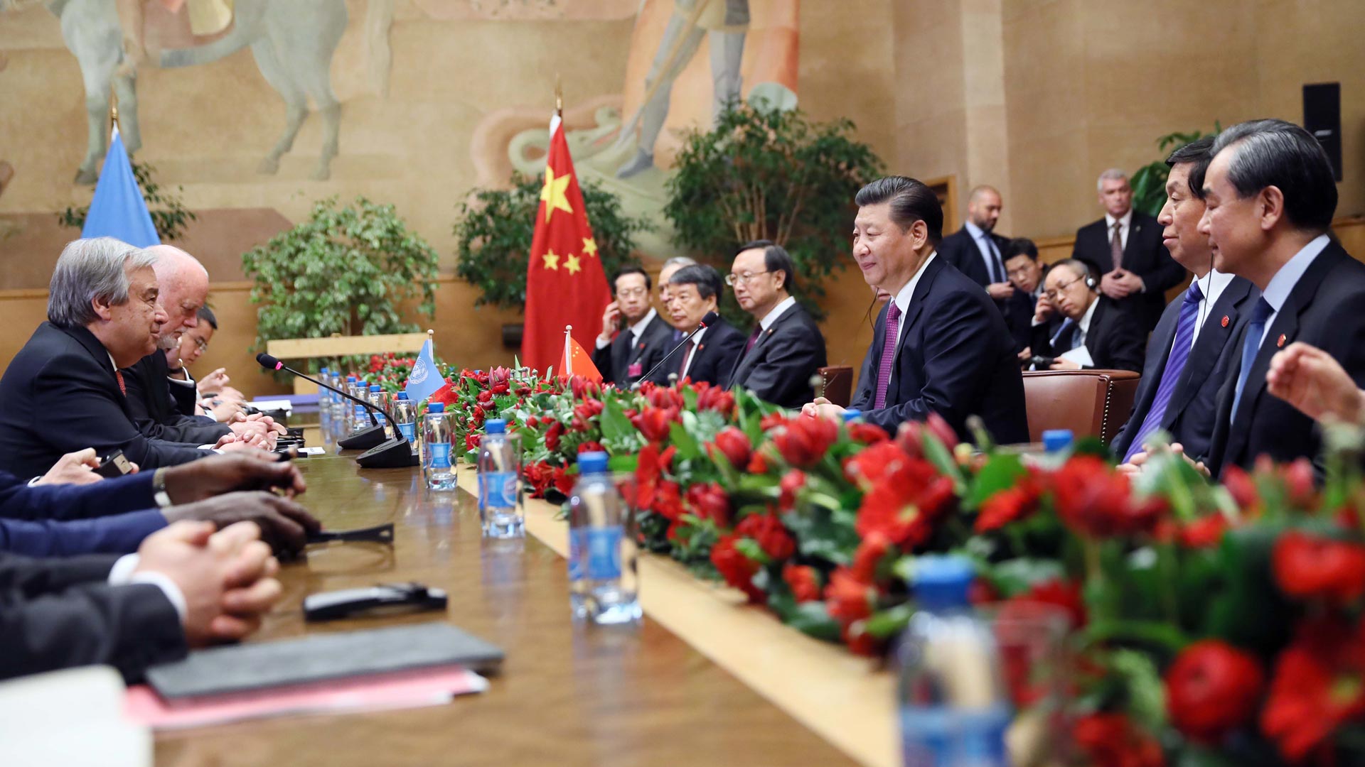1月18日,國家主席習近平在瑞士日內瓦萬國宮會見第71屆聯合國大會主席湯姆森和聯合國秘書長古特雷斯。 新華社記者 張鐸 攝2017-01-19