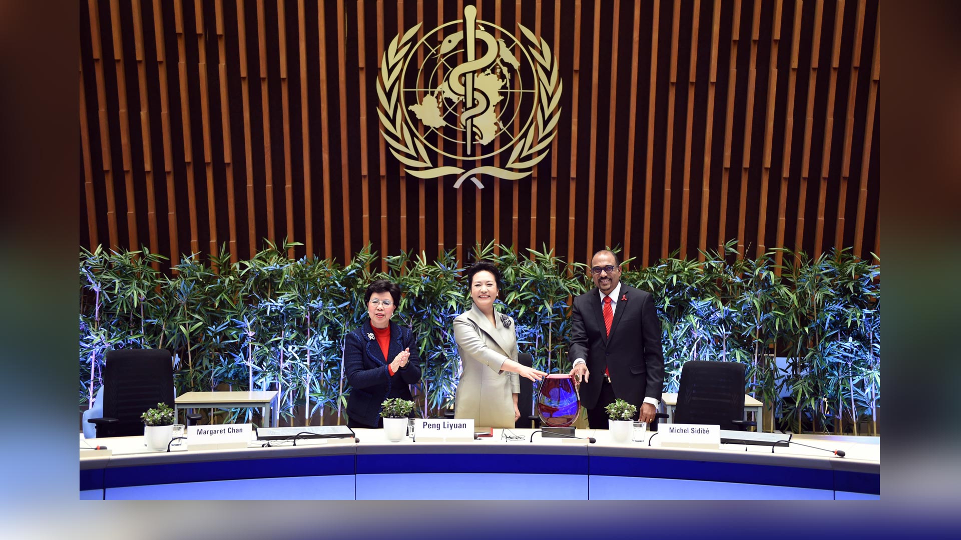 1月18日,國家主席習近平夫人、世界衛生組織結核病和艾滋病防治親善大使彭麗媛應世界衛生組織總干事陳馮富珍和聯合國艾滋病規劃署執行主任西迪貝邀請,在瑞士日內瓦出席為她舉行的親善大使任期續延暨頒獎儀式。這是世界衛生組織總干事陳馮富珍向彭麗媛頒發世衛組織榮譽勛章。新華社記者謝環馳攝2017-01-19