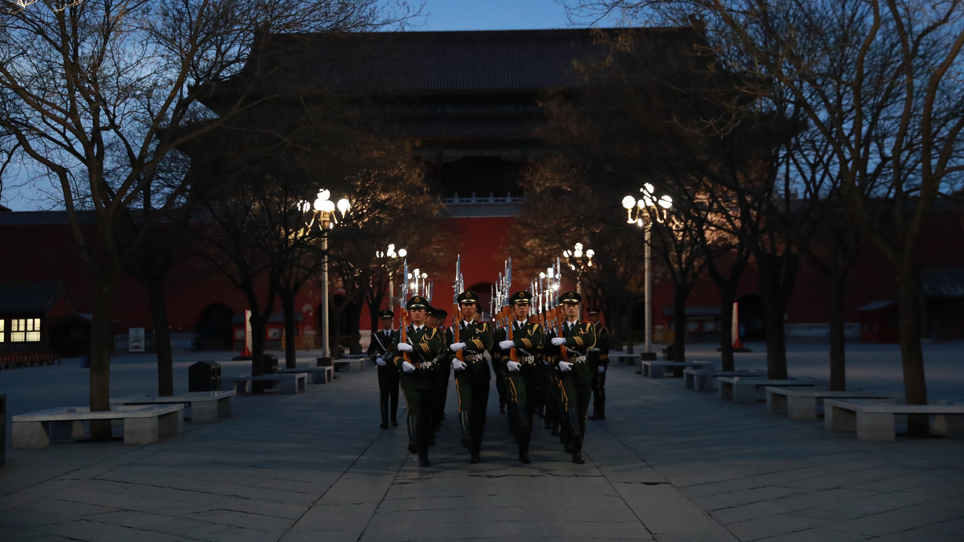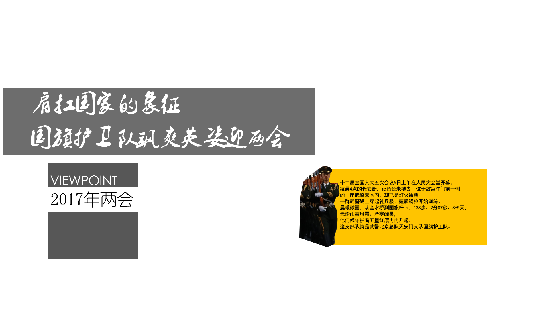 2017年3月5日,第十二屆全國人民代表大會第五次會議在人民大會堂開幕。凌晨4點的長安街,夜色還未褪去,位于故宮午門前一側的一座武警營區內,卻已是燈火通明。一群武警戰士穿起禮兵服、握緊鋼槍開始訓練。晨曦微露,從金水橋到國旗桿下,138步、2分07秒、365天,無論雨雪風霜、嚴寒酷暑,他們都守護著五星紅旗冉冉升起。這支部隊就是武警北京總隊天安門支隊國旗護衛隊。