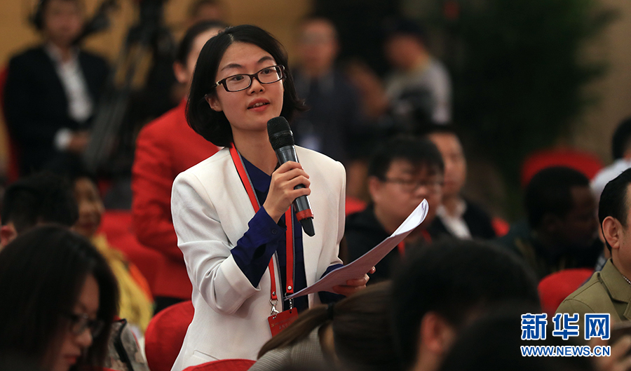 ??? 10月19日,十九大新聞中心舉辦集體采訪,邀請政法戰線代表談全面推進依法治國。圖為中國新聞社記者提問。新華網 郝廣鵬攝