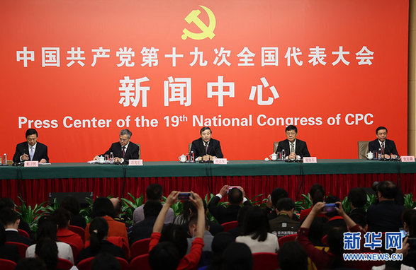 10月20日,十九大新聞中心舉行記者會,邀請中宣部、中央文明辦、文化部、新聞出版廣電總局相關負責人介紹加強思想道德和文化建設情況,并回答記者提問。圖為記者會現(xiàn)場。新華網 郝廣鵬 攝