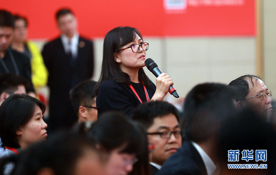 ??? 10月20日,十九大新聞中心舉辦集體采訪活動(dòng),主題為“文化發(fā)展開創(chuàng)新局面”。圖為中央人民廣播電臺(tái)記者提問(wèn)。新華網(wǎng) 陳杰攝
