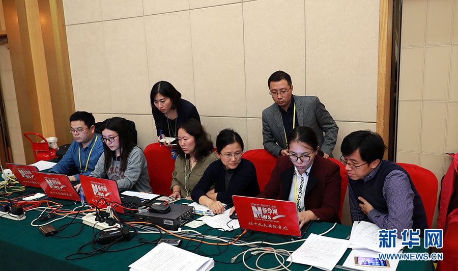 ??? 10月20日,十九大新聞中心舉辦集體采訪活動,主題為“實施創新驅動發展戰略”。圖為新華網在現場直播。新華網 郝廣鵬攝