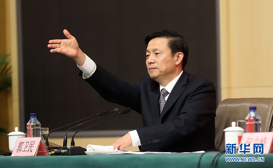 10月21日,十九大新聞中心舉辦記者招待會,邀請國家發展改革委黨組書記、主任何立峰,副主任張勇,副主任寧吉喆介紹以新發展理念為引領,推進中國經濟平穩健康可持續發展有關情況,并回答記者提問。圖為主持人郭衛民。新華網 郝廣鵬攝