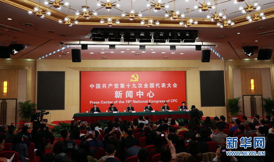 10月22日,十九大新聞中心舉辦記者招待會,邀請教育部黨組書記、部長陳寶生,民政部黨組書記、部長黃樹賢,人力資源社會保障部黨組書記、部長尹蔚民,住房城鄉(xiāng)建設(shè)部黨組書記、部長王蒙徽,國家衛(wèi)生計生委黨組書記、主任李斌介紹滿足人民新期待,保障改善民生有關(guān)情況,并回答記者提問。圖為記者招待會現(xiàn)場。新華網(wǎng) 郝廣鵬攝