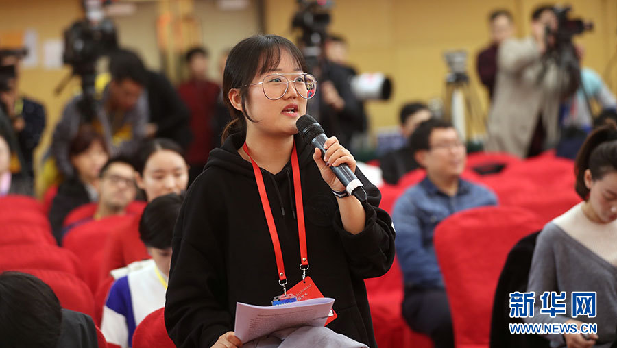 10月22日,十九大新聞中心在梅地亞中心二層新聞發布廳舉辦集體采訪活動,邀請教育領域代表談“教育綜合改革”。圖為人民日報記者提問。新華網 郝廣鵬攝