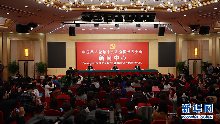 10月23日,十九大新聞中心舉辦記者招待會,邀請中央財經領導小組辦公室副主任楊偉民,環境保護部黨組書記、部長李干杰介紹踐行綠色發展理念,建設美麗中國有關情況,并回答記者提問。圖為記者招待會現場。新華網 郝廣鵬攝