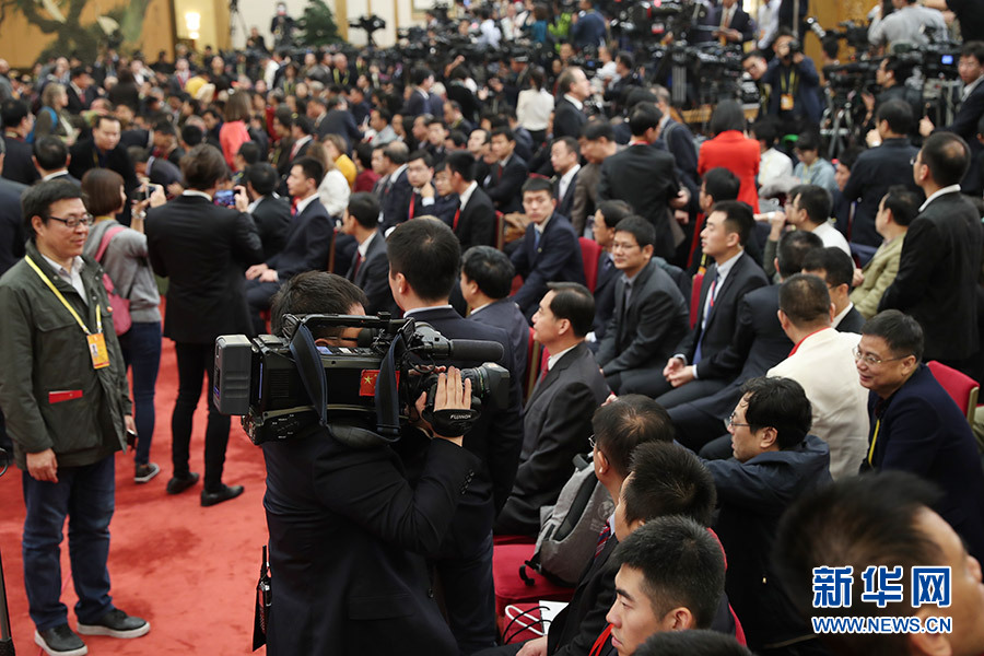 10月25日,黨的十九屆中央委員會第一次全體會議新選出的中央政治局常委將同中外記者見面。圖為中外記者在見面會現場進行準備工作。新華網 翟子赫 攝