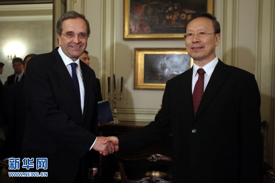 ??? 11月18日,希臘總理薩馬拉斯(左)在首都雅典會見到訪的中共中央書記處書記、全國政協副主席杜青林。 新華社發(馬里奧斯·羅洛斯攝)