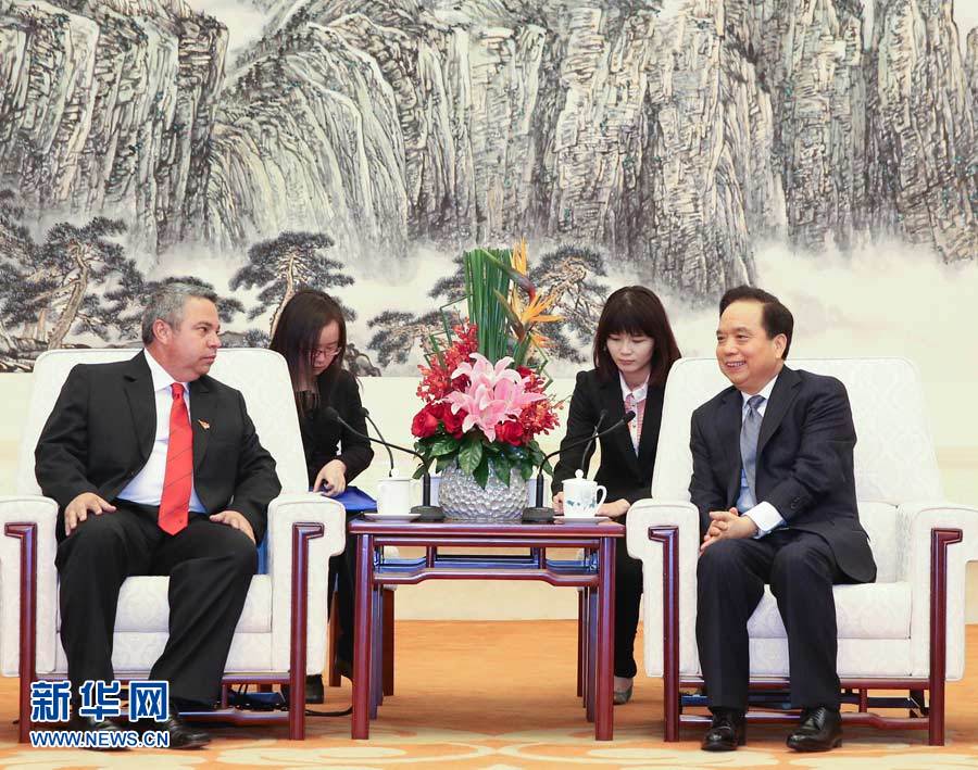 ??? 4月8日,中共中央政治局委員、中華全國總工會主席李建國在北京會見古巴國務委員會委員、古共中央委員、古巴工人中央工會總書記吉拉特。新華社記者丁林攝