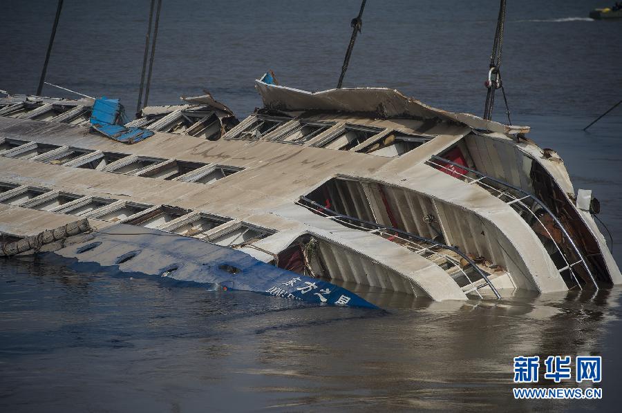 “東方之星”號(hào)游輪正在被扶正(6月5日攝)。當(dāng)天8時(shí)30分左右,“東方之星”沉船正在被扶正,已露出頂部及四層和三層。 。 新華社記者 肖藝九 攝