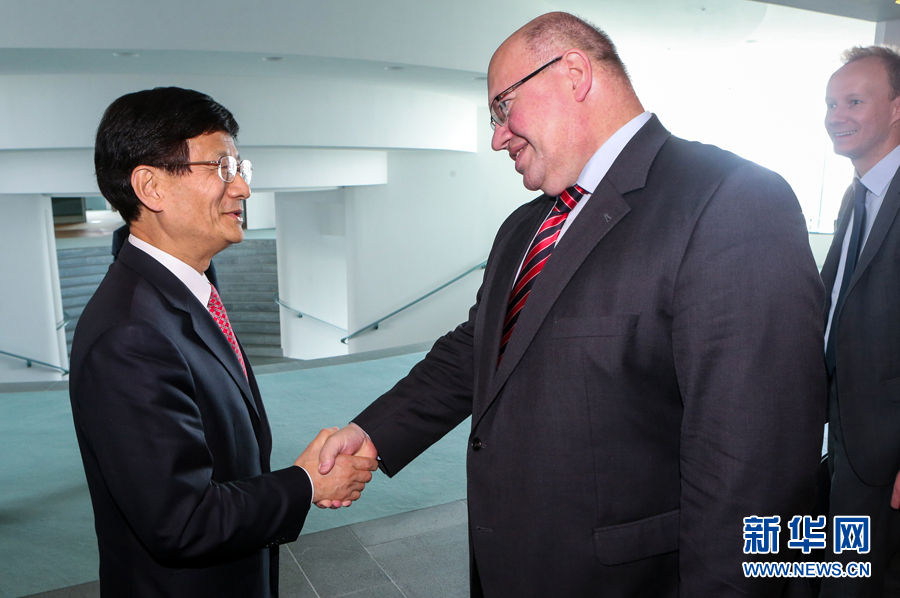 ??? 6月29日,習近平主席特使、中共中央政治局委員、中央政法委書記孟建柱(左)在德國首都柏林會見德國總理府部長阿爾特邁爾。新華社記者張帆攝