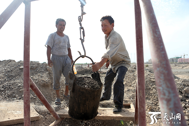 一根繩、一個桶、一輛拖拉機頭,就是庫爾班·司馬義所有的作業工具。下井時,人坐在一個T形的鐵管上,用繩索固定好,一頭連著的拖拉機緩緩開動,將繩索這頭的人吊入豎井中。大約七八分鐘后,拖拉機后退,一小桶泥沙從井里升上來,庫爾班和伙計們小心地站在井口,伸手取下桶來,將泥沙倒掉又掛在繩索上,如此重復。