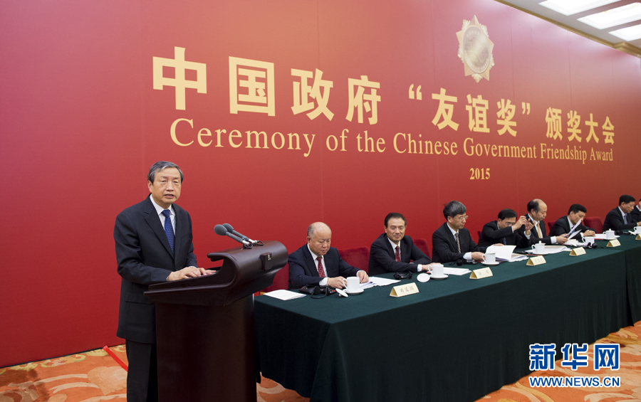??? 9月29日,2015年度中國(guó)政府“友誼獎(jiǎng)”頒獎(jiǎng)大會(huì)在北京人民大會(huì)堂隆重舉行。國(guó)務(wù)院副總理馬凱向獲獎(jiǎng)外國(guó)專家頒獎(jiǎng)并講話。 新華社記者謝環(huán)馳 攝