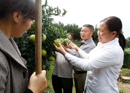 圖為四川成都蒲江縣西來鎮兩河村支書姚慶英關心村民的柑橘生產。王若冰攝