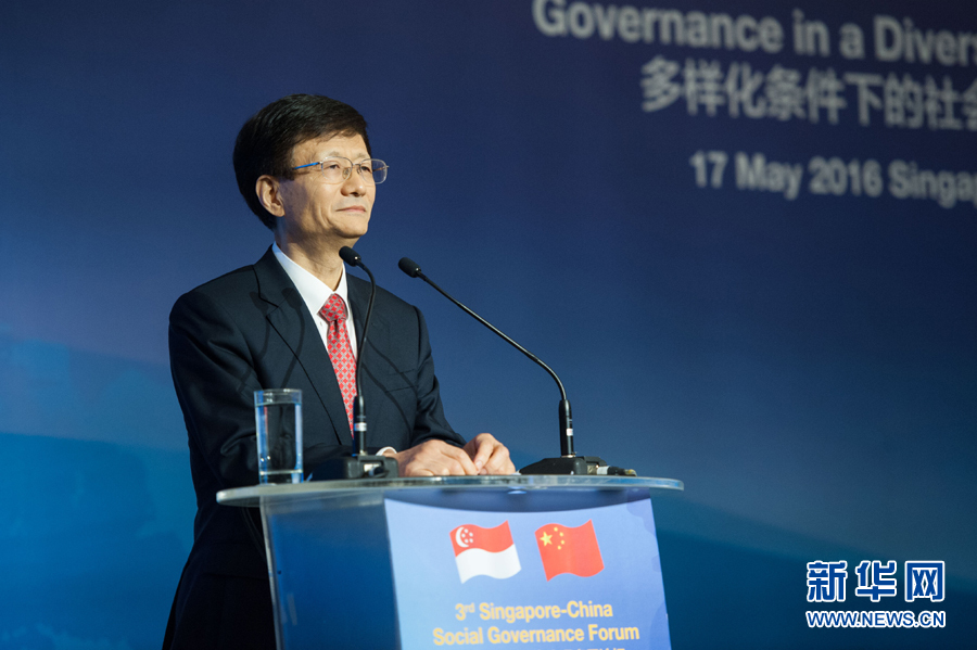 5月17日,中共中央政治局委員、中央政法委書記、中央綜治委主任孟建柱出席在新加坡舉行的第三屆中新社會治理高層論壇。新華社發(fā)(王應耀攝)