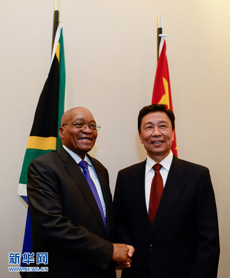 11月22日,南非共和國(guó)總統(tǒng)、非洲人國(guó)民大會(huì)主席雅各布·祖馬(左)在開(kāi)普敦會(huì)見(jiàn)應(yīng)邀訪問(wèn)的中國(guó)國(guó)家副主席李源潮。 新華社記者翟健嵐攝