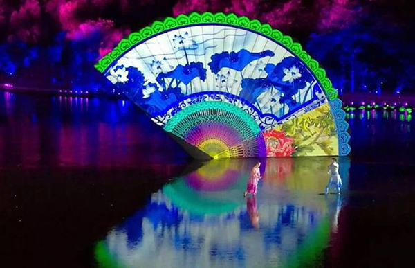 2016年9月4日晚,一場名為“最憶是杭州”的文藝演出在杭州西子湖畔進行室外表演。隨著《春江花月夜》《采茶舞曲》帶著中國傳統文化的韻律登臺表演,360度巨型圓扇在水面上完美地映射出來,點燃了文藝晚會的高潮。