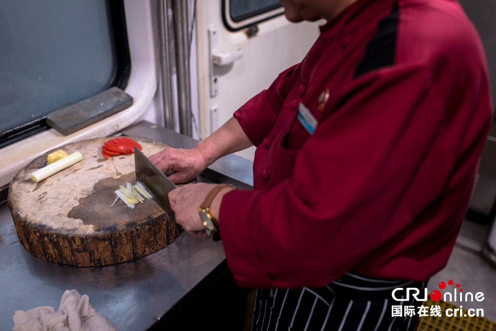 列車(chē)上的廚師和一般的餐廳廚師最大的區(qū)別在于“晃”,火車(chē)在運(yùn)行中顛簸不斷,“最重要的是腿要分開(kāi),站成外八字,扎好馬步,隨著車(chē)廂晃動(dòng)的方向,這樣才能穩(wěn)當(dāng)。”白師傅說(shuō)。