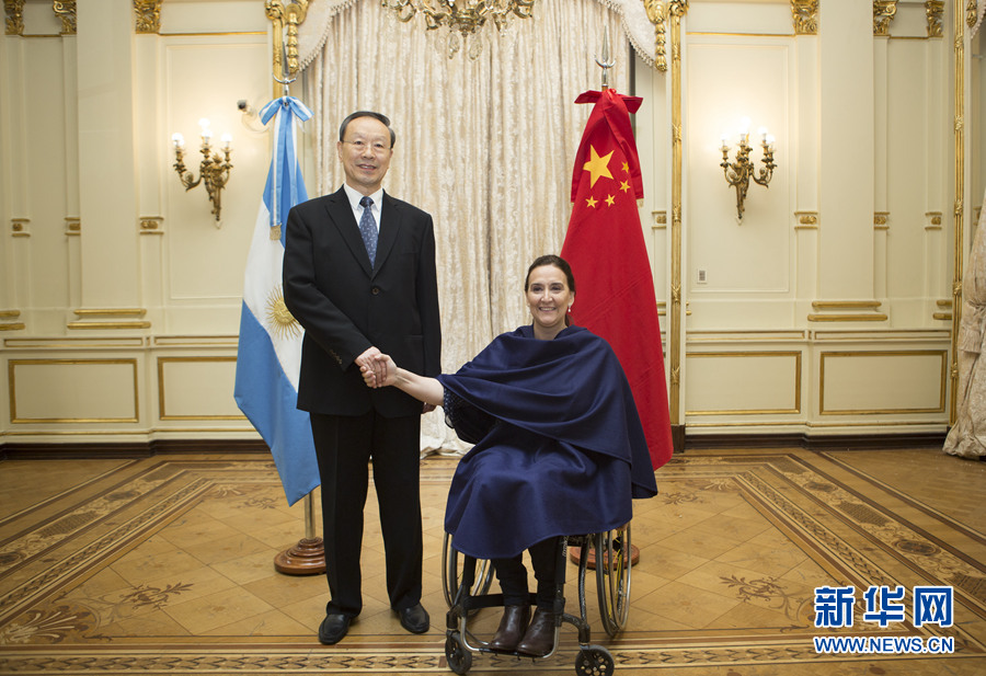 7月7日,中共中央書記處書記、全國政協副主席杜青林(左)在阿根廷首都布宜諾斯艾利斯會見阿根廷代總統兼參議長米切蒂。新華社發(馬丁·薩巴拉攝)