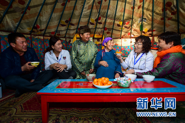 家庭責(zé)任醫(yī)務(wù)人員與阿巴嘎旗牧民道力格爾瑪一家拉家常(2月20日攝)。為緩解牧民看病難問(wèn)題,從2013年起,阿巴嘎旗給超出衛(wèi)生院服務(wù)半徑10公里的每戶牧民配備小藥箱,安排家庭責(zé)任醫(yī)生,還購(gòu)買了12臺(tái)內(nèi)置B超機(jī)、心電圖機(jī)、尿液分析儀等醫(yī)療設(shè)備的流動(dòng)服務(wù)車。新華社記者 連振 攝
