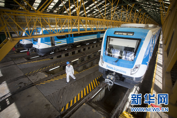 這是在位于阿根廷首都布宜諾斯艾利斯以南的利亞瓦略爾拍攝的中國中車為羅卡線城際鐵路提供的列車(4月11日攝)。新華社發(馬丁·薩巴拉攝)