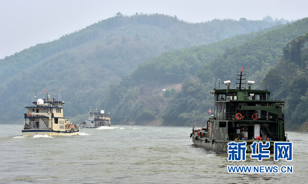 中老緬泰聯合巡邏執法船在瀾滄江-湄公河上的云南西雙版納關累港的江面上行駛(2015年3月17日攝)。新華社記者 陳海寧 攝