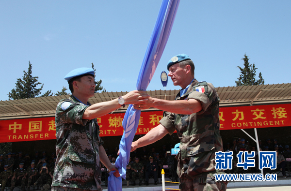在黎巴嫩南部辛尼亞村的中國營舉行的中國赴黎維和部隊輪換交接儀式上,聯合國駐黎巴嫩臨時部隊(聯黎部隊)參謀長皮埃爾(右)將聯合國旗交到中國第16批赴黎維和部隊指揮長黃云手中(5月22日攝)。新華社記者 李良勇 攝