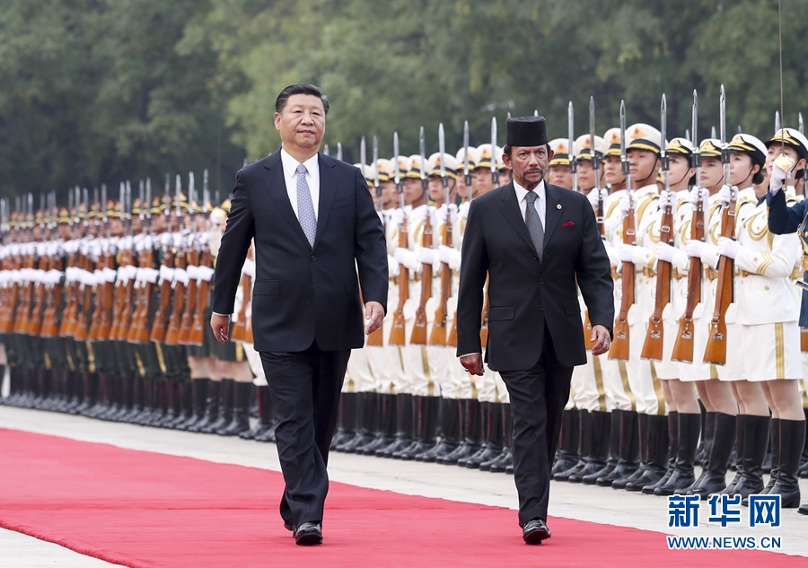 9月13日,國家主席習近平在北京人民大會堂同文萊蘇丹哈桑納爾舉行會談。這是會談前,習近平在人民大會堂東門外廣場為哈桑納爾舉行歡迎儀式。新華社記者 謝環馳 攝