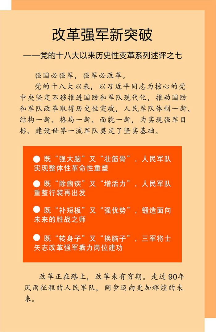 改革正在路上,改革未有窮期。走過90年風(fēng)雨征程的人民軍隊,闊步邁向更加輝煌的未來。