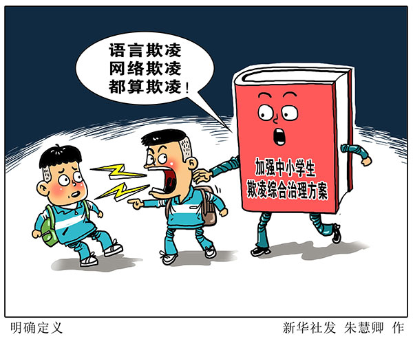 教育部教育督導局局長、國務(wù)院教育督導委員會辦公室主任何秀超介紹,在11部門聯(lián)合印發(fā)的方案中,首次對學生欺凌作出明確界定,指出中小學生欺凌是發(fā)生在校園內(nèi)外、學生之間,一方單次或多次蓄意或惡意通過肢體、語言及網(wǎng)絡(luò)等手段實施欺負、侮辱,造成另一方身體傷害、財產(chǎn)損失或精神損害等的事件。