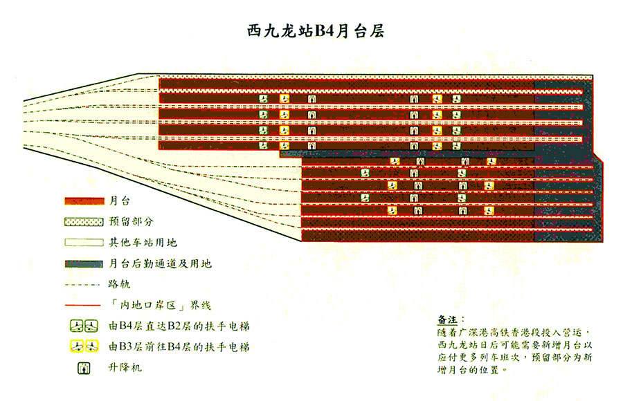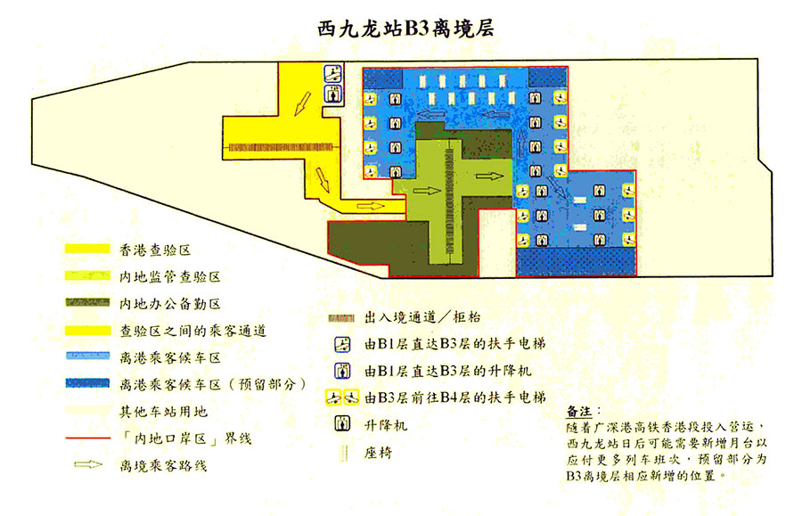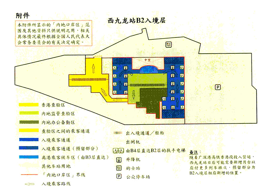 第二條 內地口岸區(qū)的范圍為西九龍站地下二、三層的劃定區(qū)域、地下四層月臺區(qū)域及有關連接通道,包括內地監(jiān)管查驗區(qū)、辦公備勤區(qū)、離港乘客候車區(qū)、車站月臺和連接通道及電梯。內地口岸區(qū)范圍的詳情見附件。